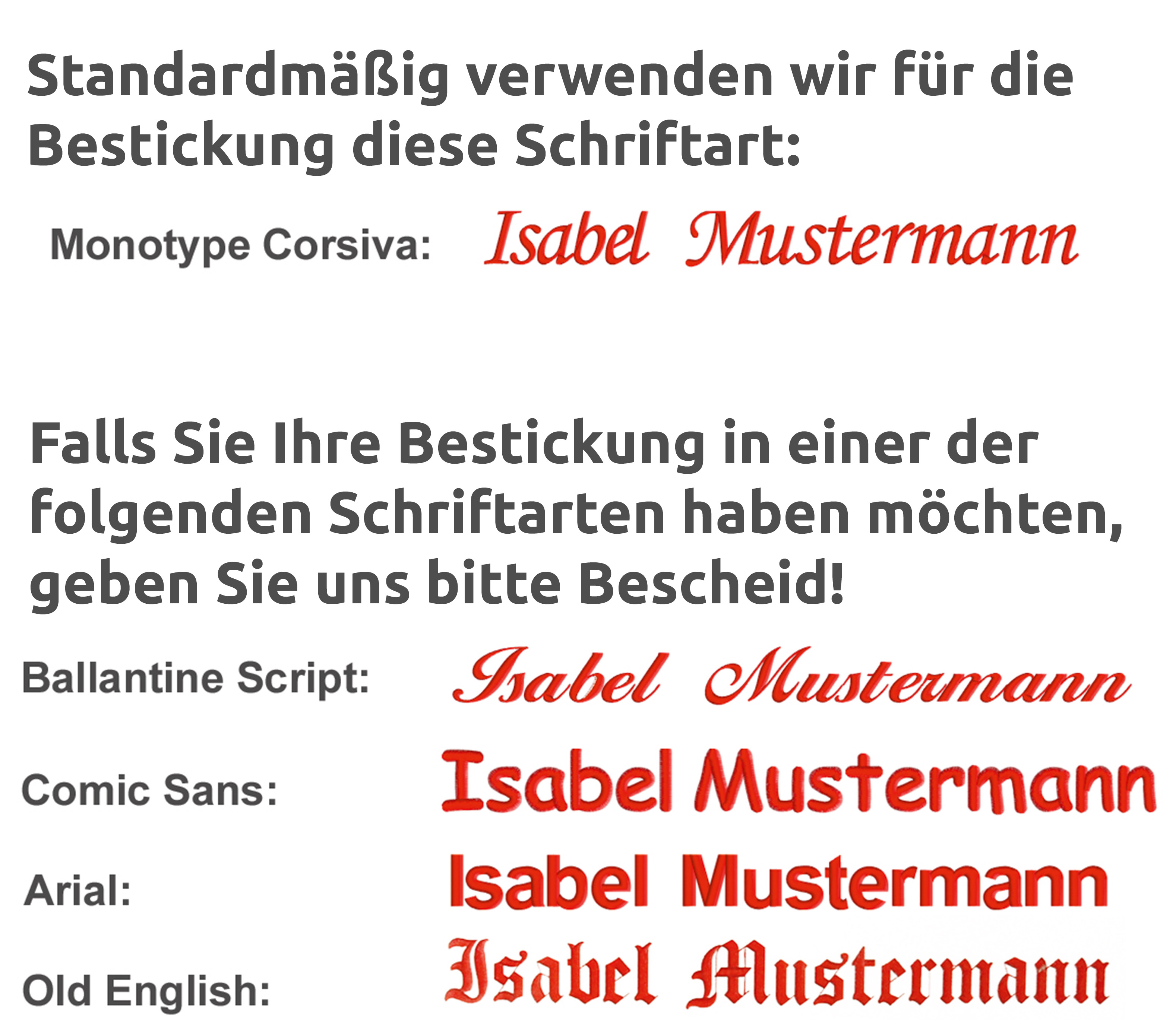 Bitte geben Sie den Namen oder Schriftzug, der gestickt werden soll, ins Kommentarfeld im Bestellvorgang ein (legen Sie zunächst den gewünschten Artikel in den Warenkorb und folgen Sie den Anweisungen, bis Sie das Kommentarfeld im letzten Schritt der Bestellung angezeigt bekommen).