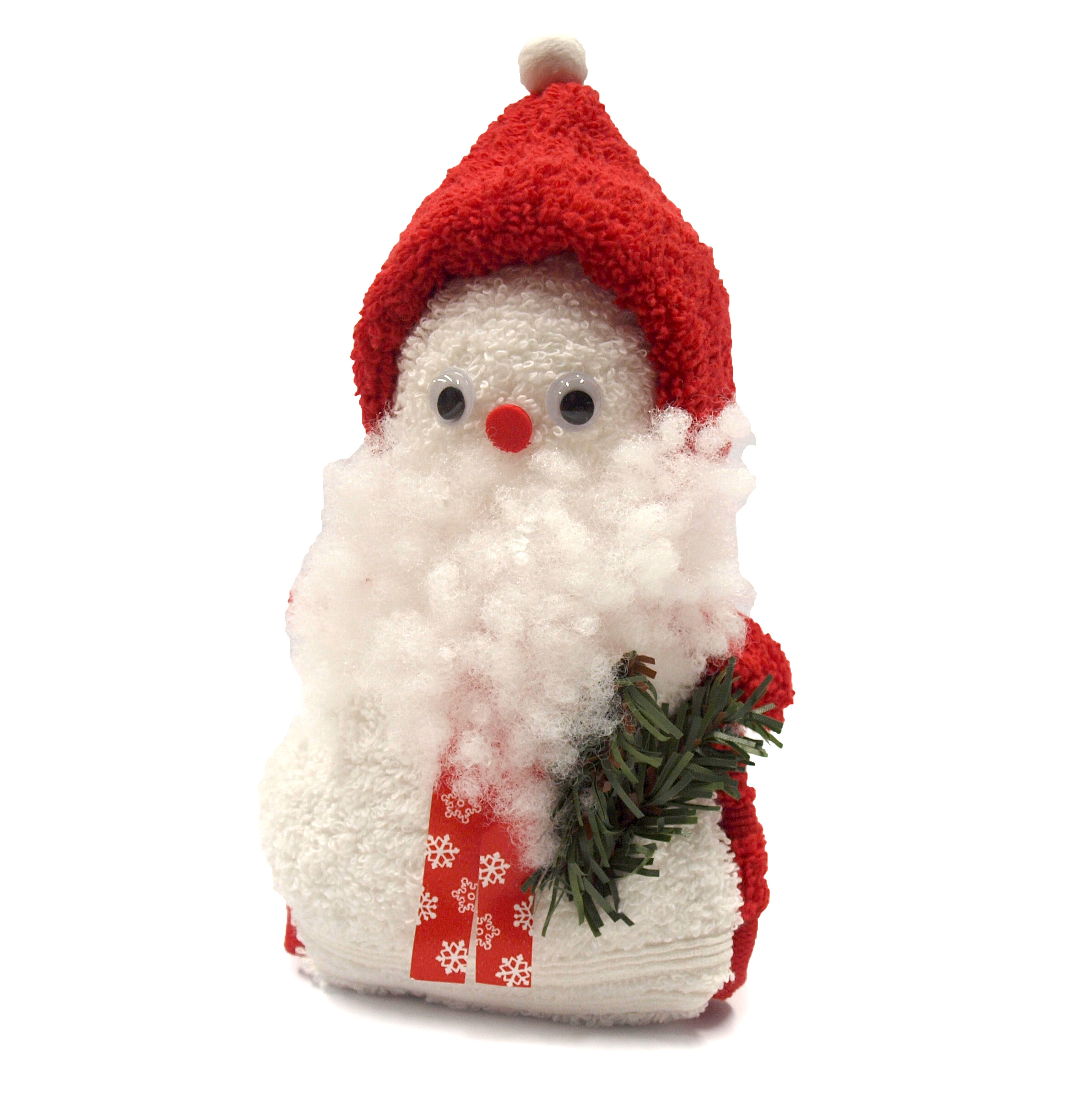Niedliche Frottier-Figur in Gestalt eines Weihnachtsmanns als ausgefallene Geschenkidee zu Nikolaus oder Weihnachten. Überraschen Sie Ihre Lieben mit dieser festlichen, von Hand angefertigten Waschlappen-Figur, bestehend aus zwei hochwertigen Waschhandschuhen. Ideal als kleines Mitbringsel oder als Wichtelgeschenk: der Weihnachtsmann wird in Klarsichtfolie bzw. -beutel verpackt geliefert und ist somit fertig zum Verschenken.