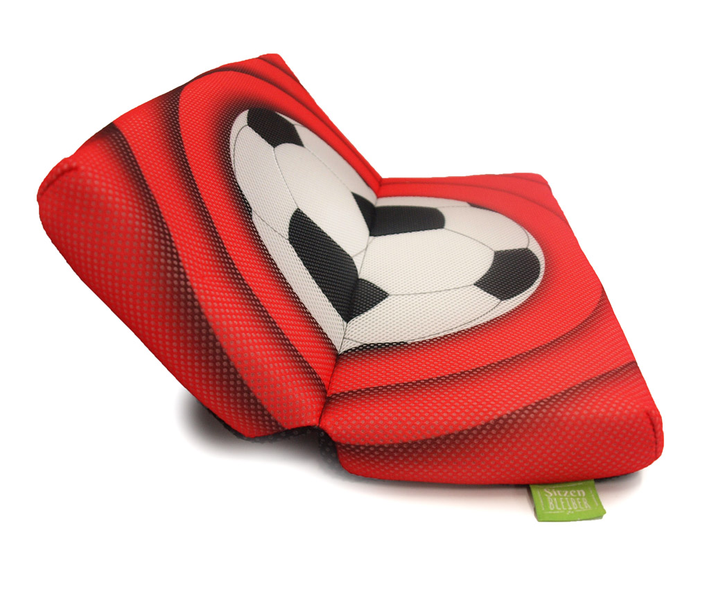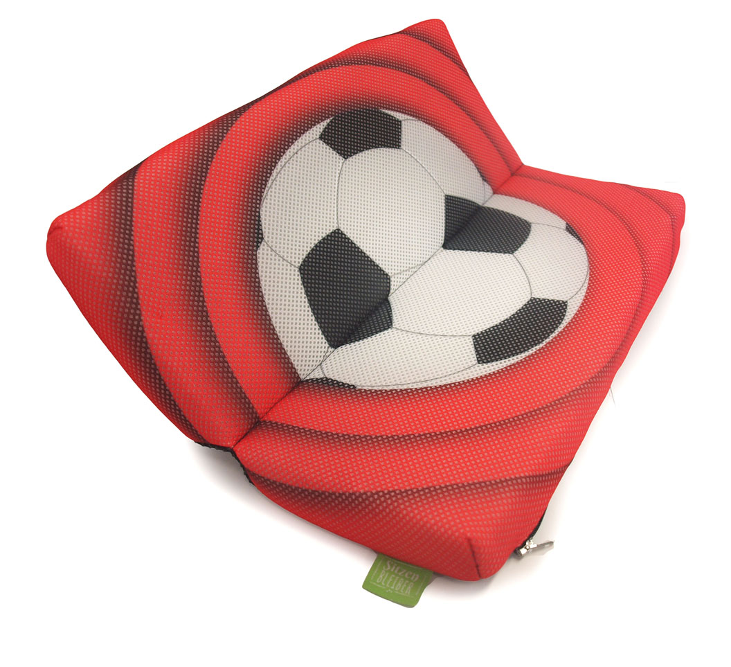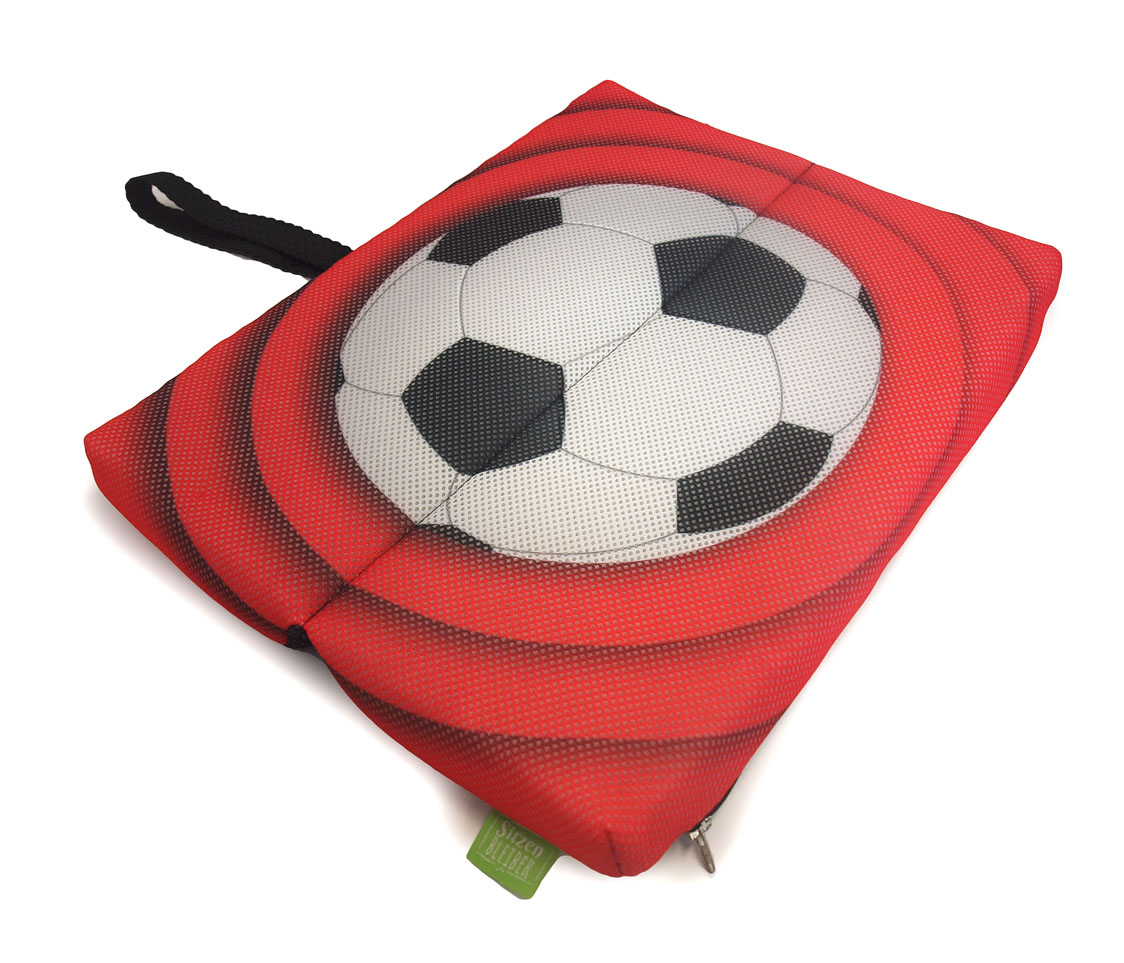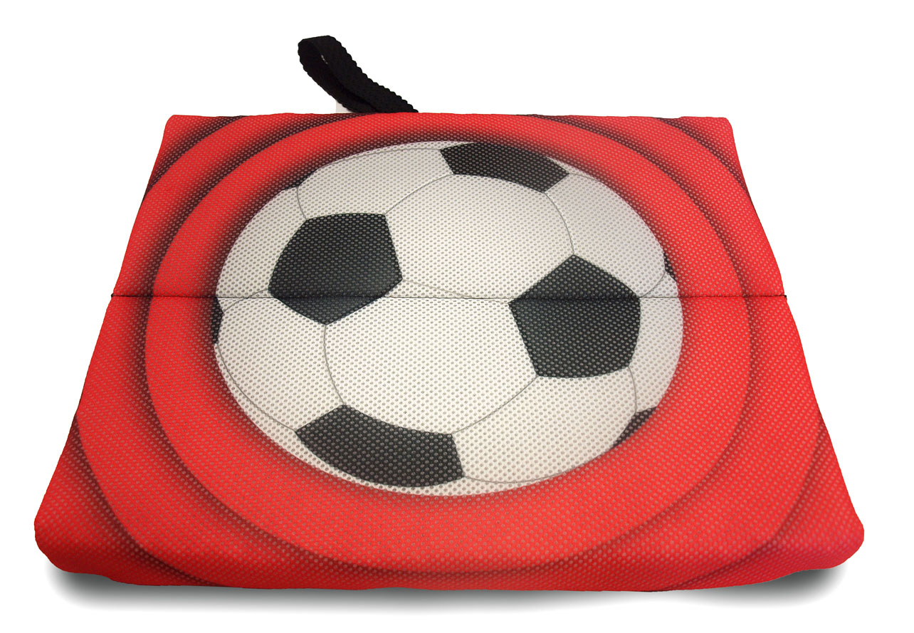 Sitzenbleiber-Klappkissen mit Fußball-Motiv auf rotem Untergrund - ein perfektes Stadionkissen für Fußballfans und ein Eyecatcher im Fußballstadion oder bei anderen Outdooraktivitäten.
