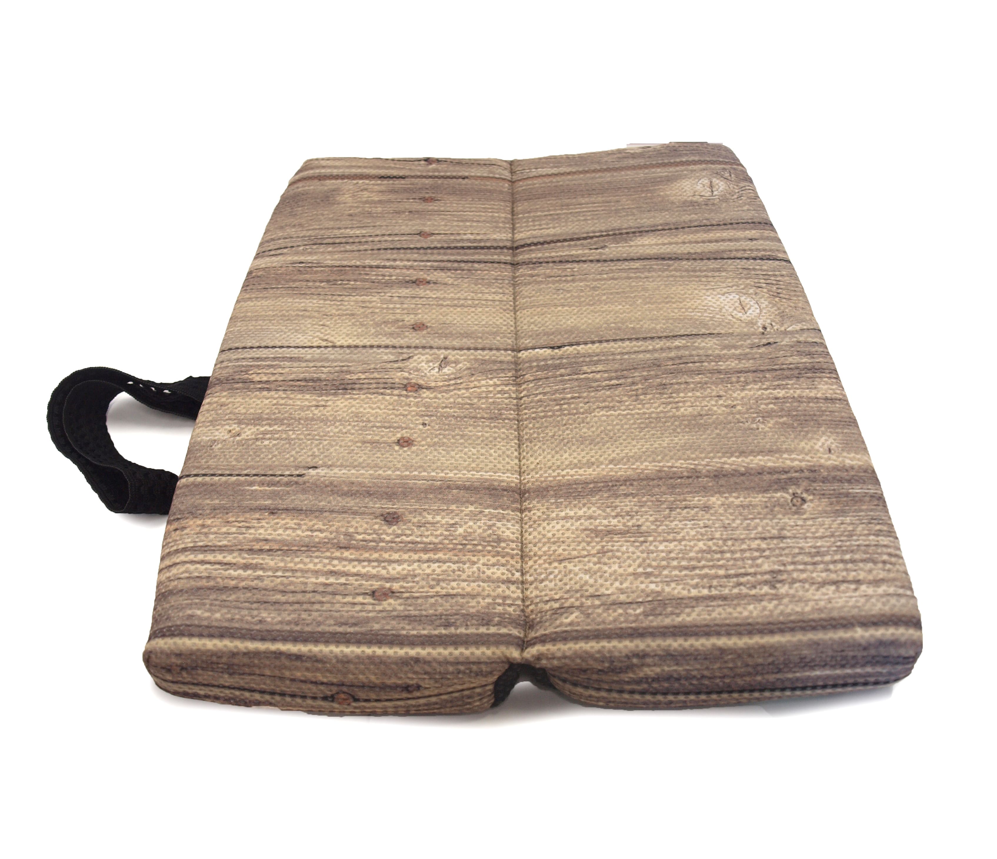 Sitzenbleiber-Klappkissen für Holzwürmer: das fotorealistische Holzmotiv wirkt täuschend echt! Dieses Klappkissen für unterwegs ist ein perfektes Geschenk für alle, die Holz lieben!
